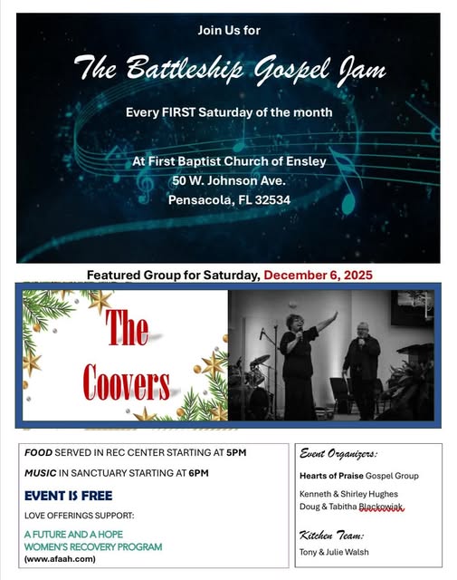 | December 6th The Crowders Love offering for Women’s Ministry | 6 PM (with small meal at 5 PM) | @ 1st Baptist Ensley |