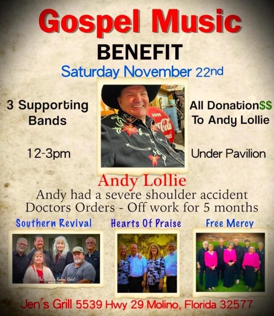 | November 22nd Benefit Singing for Andy Lolly | 12 – 3 PM | @ Jen’s Restaurant, Molino Fl |