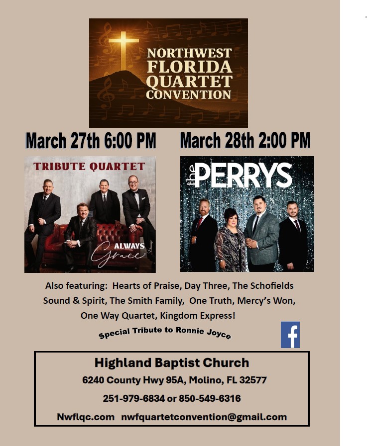 | March 27th / 28th NWF Quartet Convention See flyer for details | Friday 6 – 9:30 PM Saturday 2- 6 PM | @Highland Baptist Molino, Fl |